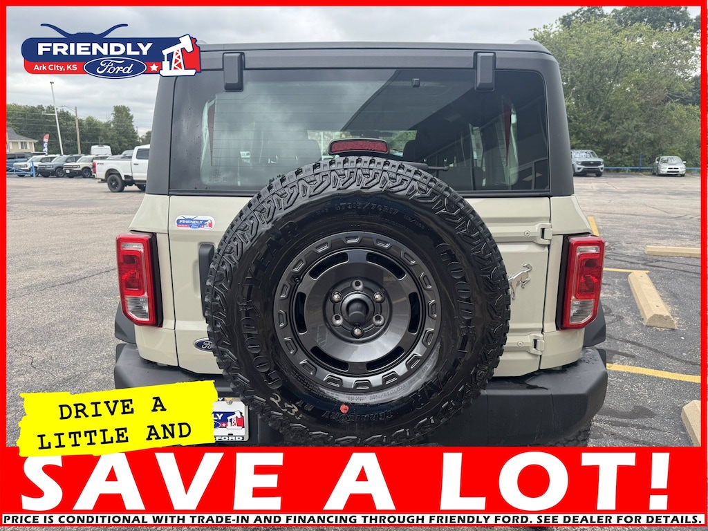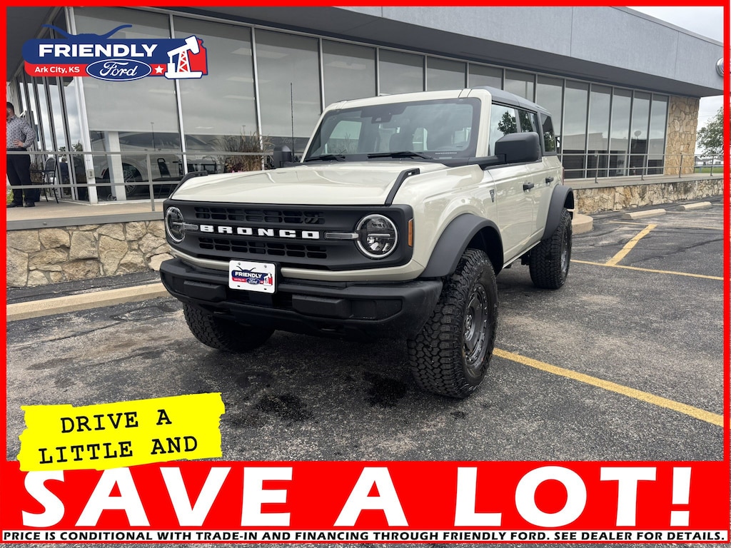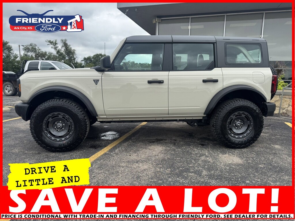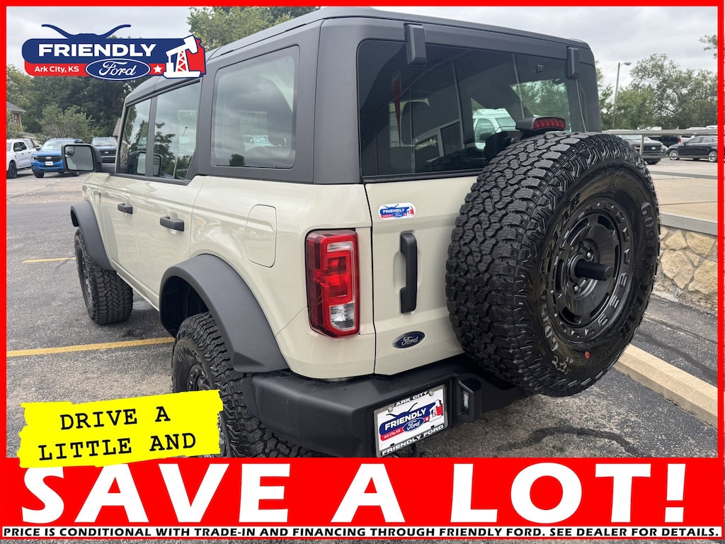 The 2025 Ford Bronco Base comes with a standard 2.3L EcoBoost I-4 engine, producing 300 horsepower and 325 lb.-ft. of torque. It offers a choice of a 7-speed manual or 10-speed automatic transmission and a standard 4x4 system with 5 G.O.A.T. Modes for superior off-road capability. Key features include a 12-inch color digital cluster, easy-to-remove doors and roof, standard 4-wheel drive, and a flexible design that's ideal for customization.