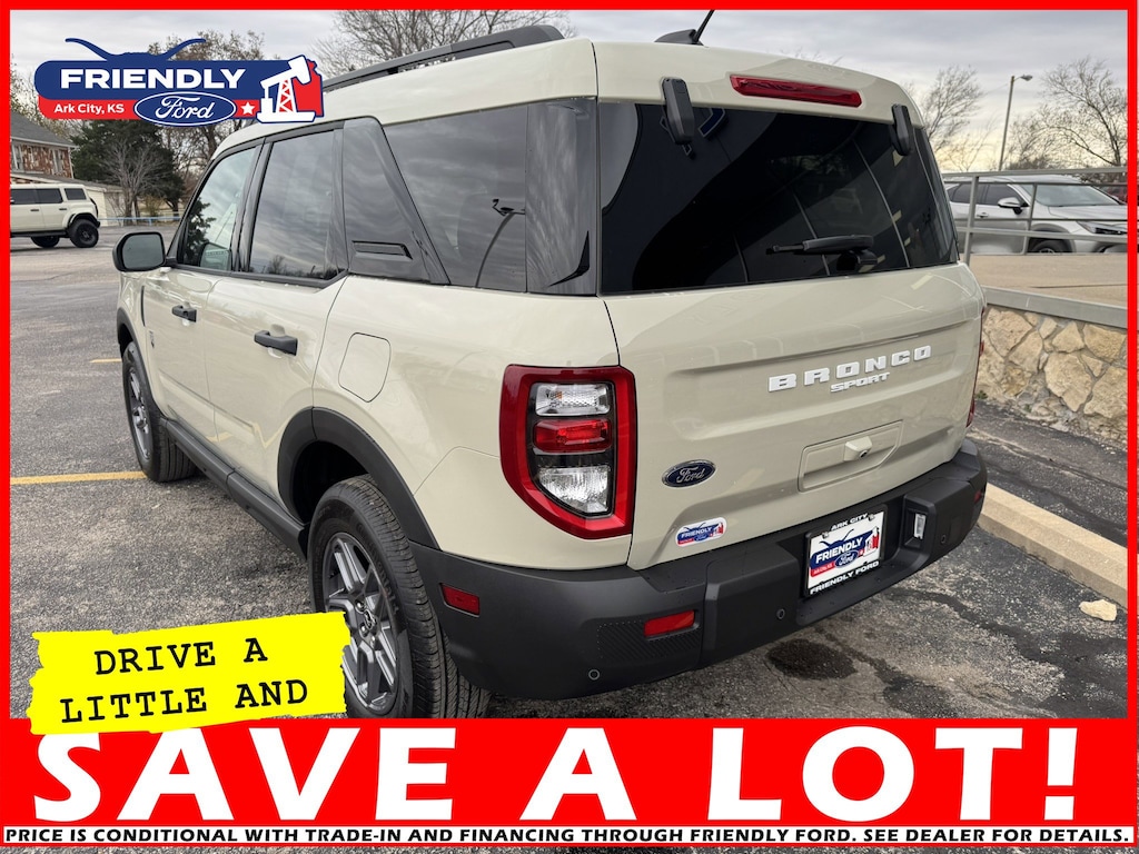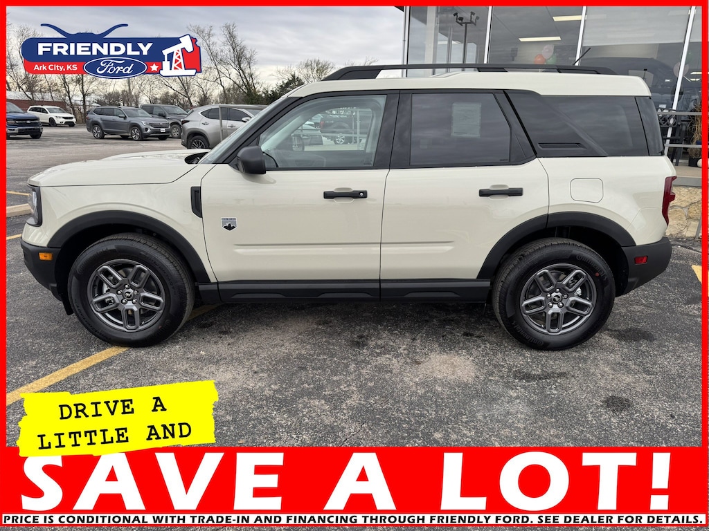 The 2025 Ford Bronco Sport Big Bend is a 4x4 SUV featuring a 1.5L EcoBoost engine, an 8-speed automatic transmission, and an estimated 25 mpg city/30 mpg highway fuel economy. Key features include SYNC 4 with a touchscreen, wireless Apple CarPlay/Android Auto, Ford Co-Pilot360 Assist+ safety technologies, and practical additions like easy-to-clean cloth seats and a 17-inch carbonized gray-painted aluminum wheel. It is equipped with a 4x4 drivetrain, offering multiple terrain modes for different driving conditions.
